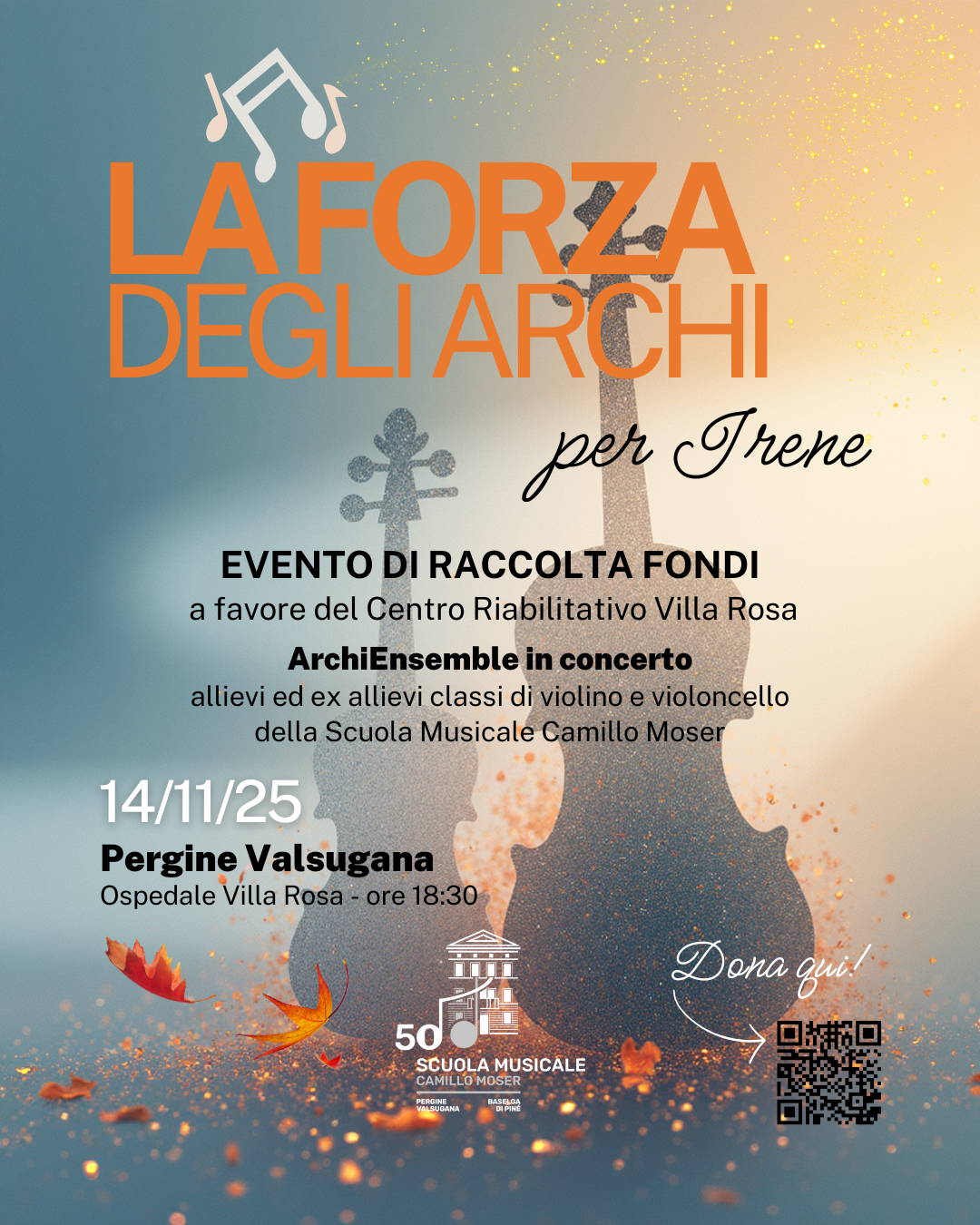 Dal legame tra alcuni allievi violinisti della Scuola Musicale Camillo Moser e Irene, giovane violinista in cura a Villa Rosa, nasce l'idea di un concerto benefico presso il Centro Riabilitativo di Pergine. Lo scopo è di raccogliere fondi per l'acquisto di un'attrezzatura utile ai giovani in cura nel centro. La musica unisce, cura e dona speranza.